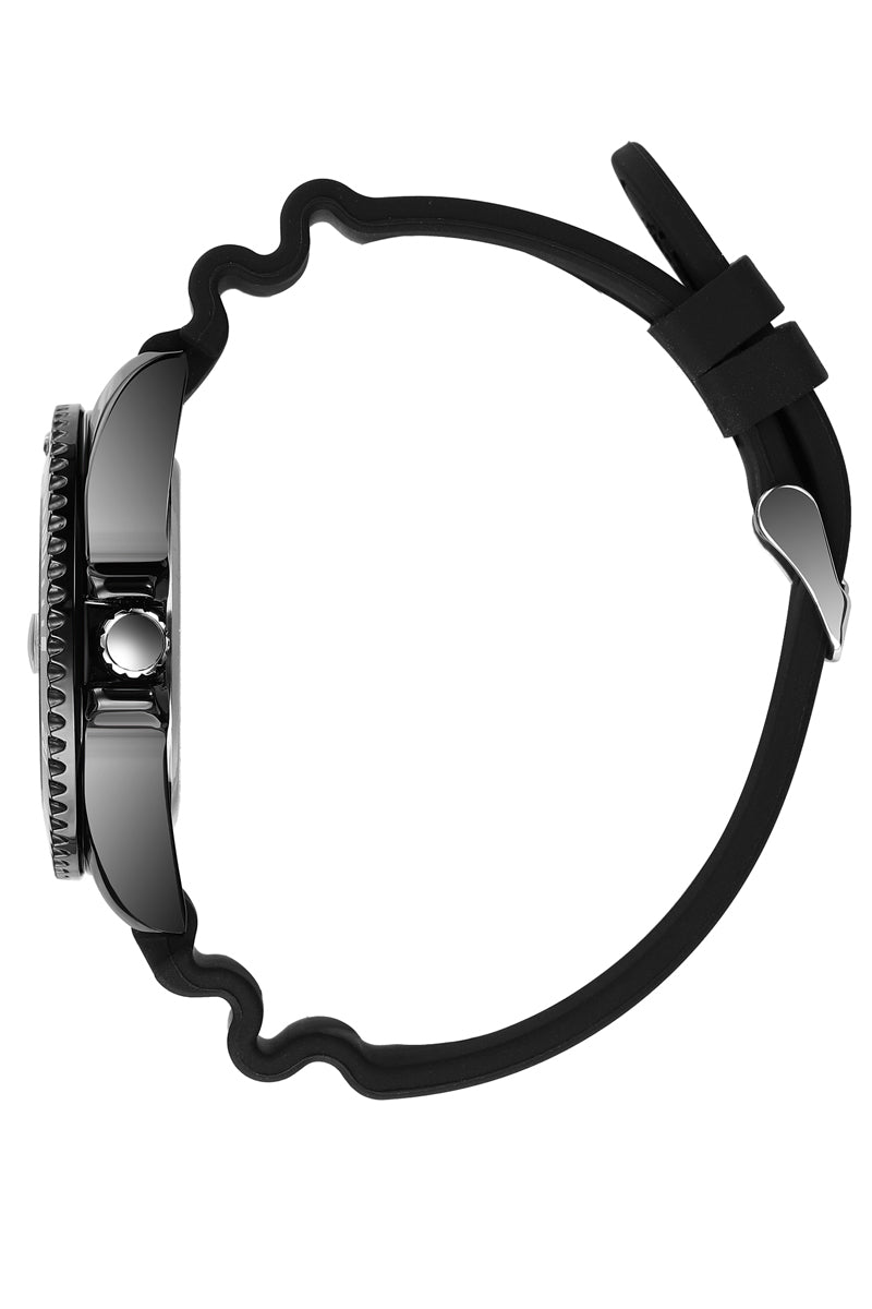 Black metal case, PU rubber strap, date.